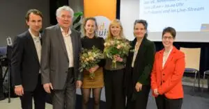 Preisverleihung Wolfgang-Tietze-Preis 2024, v.l.n.r.: Prof. Dr. Stefan Faas, Prof. Dr. Wolfgang Tietze, Wynona Kühn (Preisträgerin 2024), Simone Baumgartl (Preisträgerin 2024), Karin von Hülsen, Prof. Dr. Katharina Kluczniok